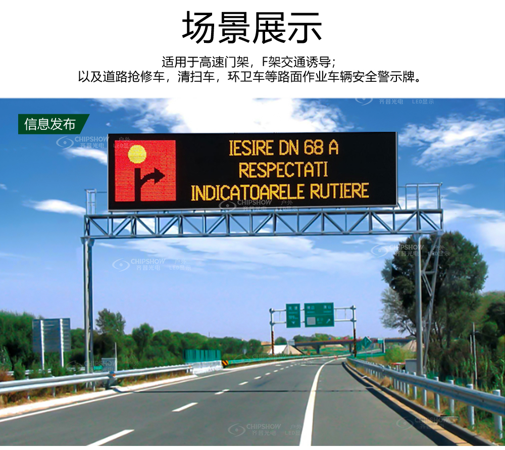 u 主要应用于高速门架,F架交通诱导;以及道路抢修车,清扫车,环卫车等路面作业车辆安全警示牌。